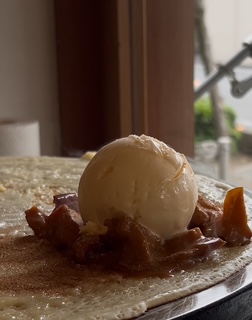 焼きたてのクレープに発酵バターを染み込ませ、キャラメリゼしたリンゴとシナモンシュガー、仕上げにアイスクリームをトッピングします。